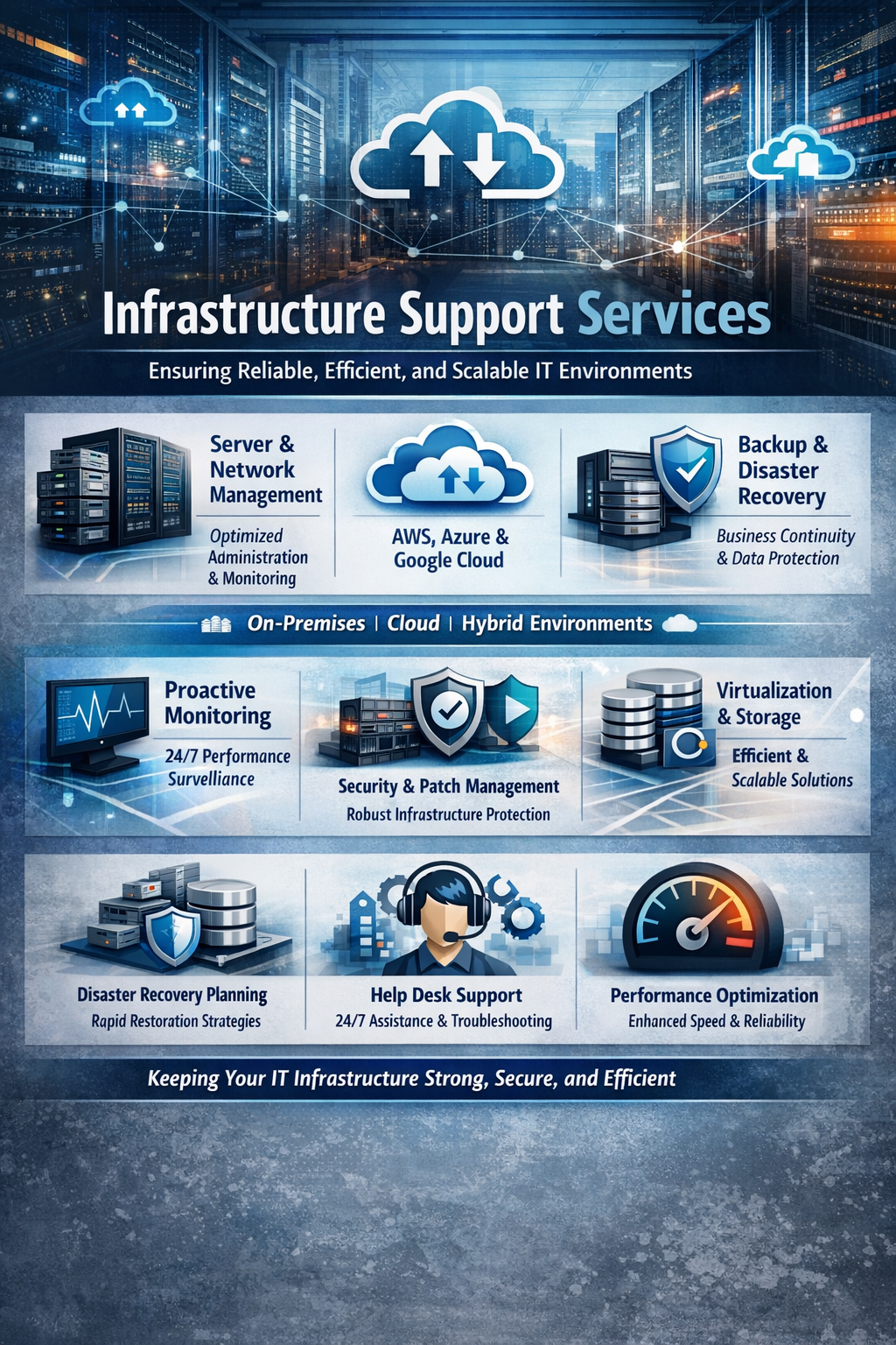 Partner with us for dependable infrastructure support that keeps your systems running smoothly, securely, and efficiently. Our commitment to proactive service, reliability, and continuous improvement ensures that your IT infrastructure remains a strong foundation for your business success.