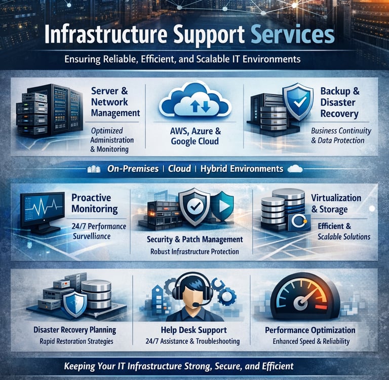 A reliable and high-performing IT infrastructure is the backbone of any successful organization. Our Infrastructure Support Services are designed to ensure your systems, networks, and platforms operate efficiently, securely, and without disruption. We provide comprehensive support solutions that enhance performance, improve reliability, and enable your business to scale with confidence.