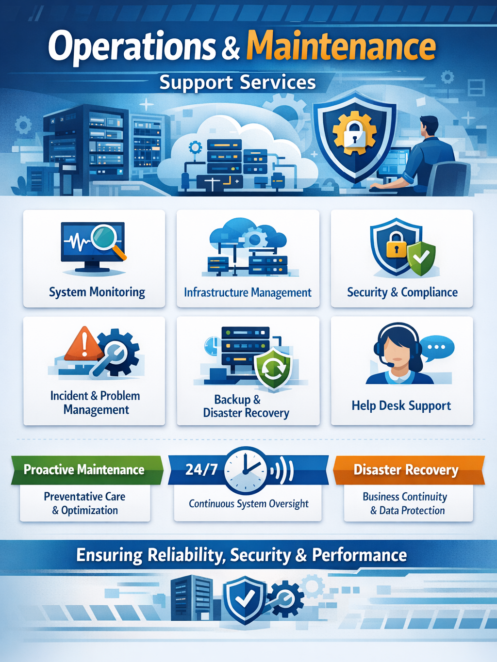 Ensuring the ongoing performance, reliability, and security of your systems is critical to business success. Our Operations & Maintenance (O&M) Support Services are designed to keep your applications, infrastructure, and IT environments running smoothly while minimizing downtime and operational risk. We provide proactive, responsive, and scalable support solutions that enable your organization to focus on core business objectives.