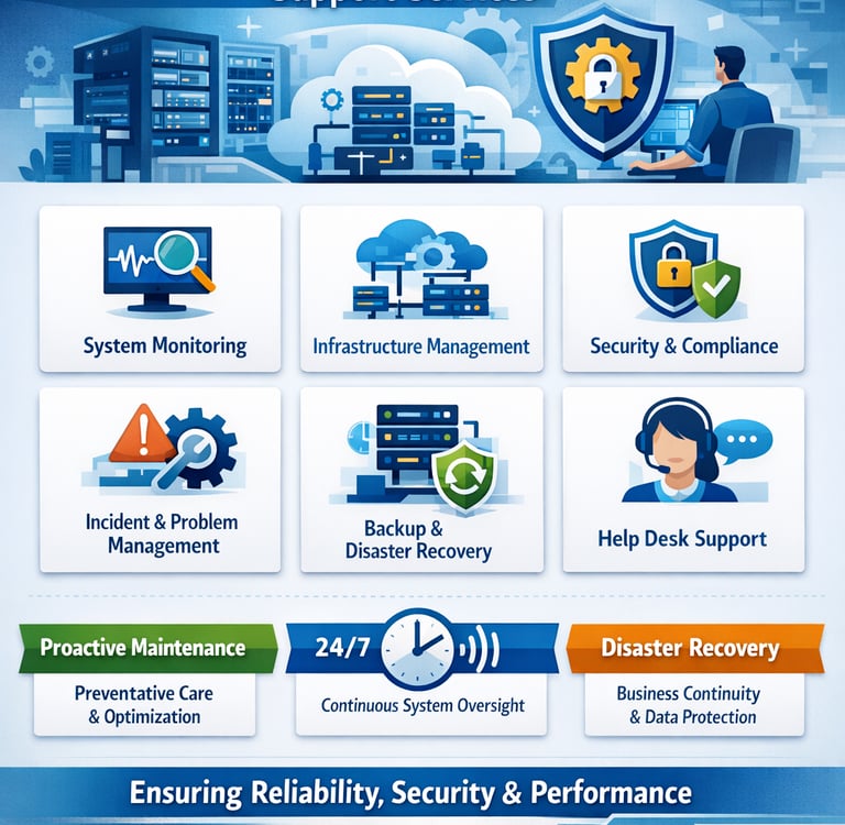 Infrastructure maintenance is a key component of our services. We support servers, networks, databases, and cloud environments to ensure seamless operations across your IT ecosystem. Our proactive maintenance approach includes regular health checks, updates, and optimization to prevent failures and improve system reliability.